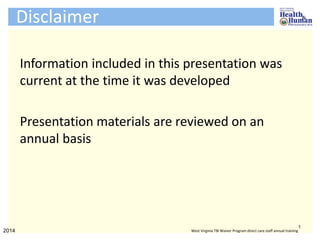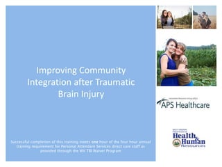 The document outlines training for direct care staff in the West Virginia TBI waiver program, focusing on community integration for individuals with traumatic brain injury (TBI). It highlights objectives such as defining community integration, understanding TBI's impacts, and strategies for improving support and involvement in the community for those affected. The document emphasizes the importance of promoting independence, social connections, and meaningful engagement to facilitate better outcomes for individuals with TBI.