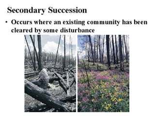 Community interactions powerfully affect ecosystems through various types of relationships between species including competition, predation, herbivory, symbiosis, and disease. These interactions drive community structure and dynamics. Communities tend to have short food chains due to inefficiencies in energy transfer and limits to animal size. Dominant, keystone, and foundation species play important roles in determining community composition through competitive and facilitative effects. Ecological succession involves predictable changes in communities over time in response to disturbances.