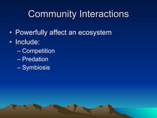 Community interactions include competition, predation, and symbiosis. Competition occurs when organisms attempt to use the same ecological resource, leading to winners and losers. Predation involves one organism capturing and feeding on another. Symbiosis is a close relationship between two species, and includes mutualism, commensalism, and parasitism. Ecosystems are constantly changing over time through ecological succession in response to disturbances. Succession involves predictable changes in a community's composition as older species decline and new species move in.