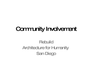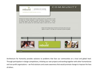 Architecture for Humanity provides design solutions to improve communities locally and globally. The organization is currently working on retrofitting an orphanage in Kenya to expand facilities and infrastructure. Locally, a competition called Project Find is being held in San Diego in fall 2009 to increase environmental and social awareness through visual projects. The winner will receive funds to implement their proposal. Architecture for Humanity also supported local teams in a global classroom design competition to create sustainable, stimulating learning spaces.