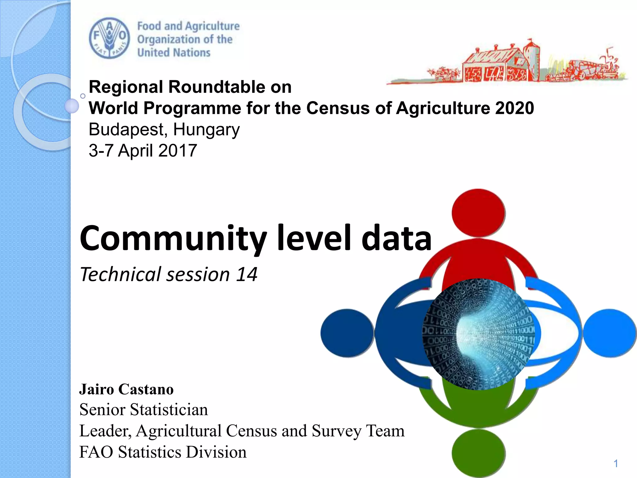 This document discusses community-level data collection for agricultural censuses. It recommends collecting key administrative data on communities to complement farm-level census data. Examples of community data include infrastructure, services, economic activities and weather conditions. Tabulating community data by classification variables allows analysis of farm data grouped by community characteristics. While optional, community surveys provide useful information for development planning with low additional costs. Country experiences show collecting data on land, households, services and development projects at the community level.