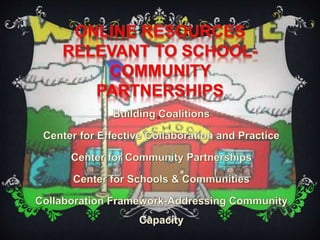 The document discusses community linkages between schools and local resources. It outlines how partnerships can benefit schools and communities by sharing facilities, volunteers, expertise and more. This enhances educational opportunities, strengthens neighborhoods, and leads to improved outcomes for youth and families. Effective collaboration requires strategic planning from professionals in schools and communities.