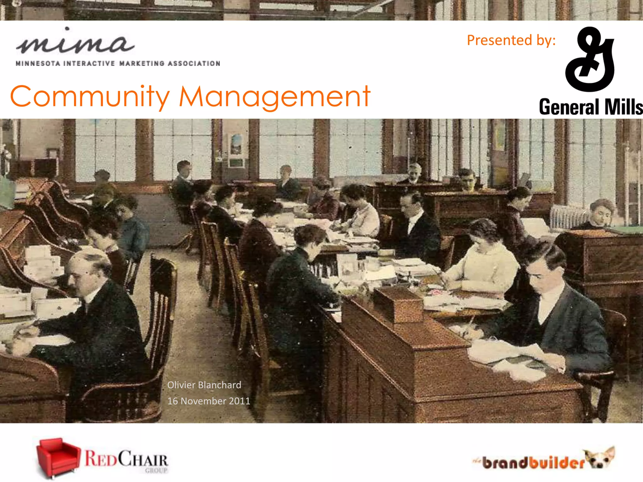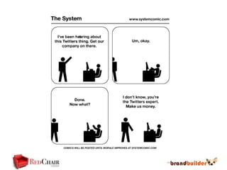 The document discusses the importance and roles of community managers in leveraging social media to enhance business objectives such as customer acquisition and retention. It emphasizes the need for community managers to engage authentically with their communities and outlines the qualities and skills necessary for effective community management. Additionally, it highlights that the social media director should be responsible for identifying and developing community managers through proper training and evaluation.