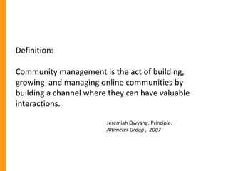Community management involves building and managing online communities to facilitate valuable interactions. It is structured around four pillars: experience, conversation, content, and collaboration, each focusing on engaging audiences and enhancing their participation. Successful community management encourages audience empowerment and fosters advocacy through responsive and collaborative efforts.