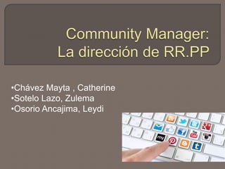 El documento define el rol del Community Manager como la persona encargada de cuidar y mantener la comunidad de seguidores de una marca o empresa, actuando como nexo entre las necesidades de los usuarios y las posibilidades de la empresa. Un Community Manager utiliza herramientas en línea para generar flujos de comunicación, responder a peticiones de clientes, y transmitir mensajes que comprendan el lenguaje en línea de la comunidad. Adicionalmente, recopila información de los usuarios para la empresa y mantiene a los clientes actualizados mediante técnicas de marketing