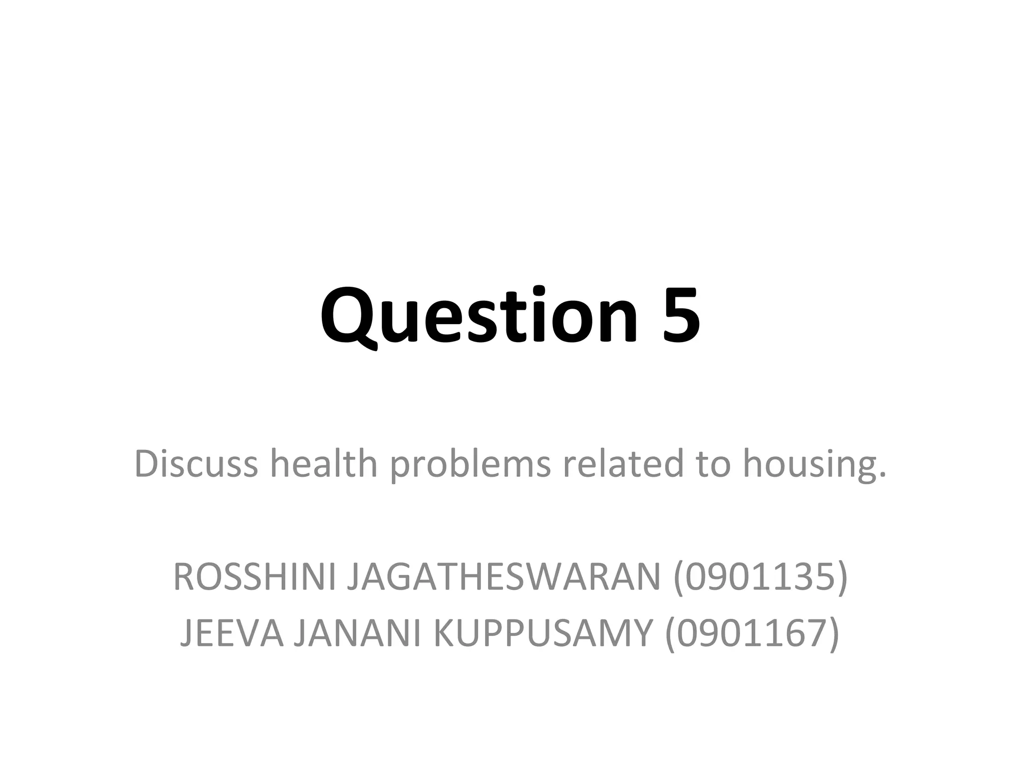 This document discusses several health problems that can be related to housing, including respiratory infections from issues like poor ventilation, skin infections from crowding and unsanitary conditions, rat and insect infestations that can spread diseases, accidents from structural defects, increased mortality and morbidity rates from housing-related illness, and psychosocial effects like isolation and overcrowding that can cause mental health issues.