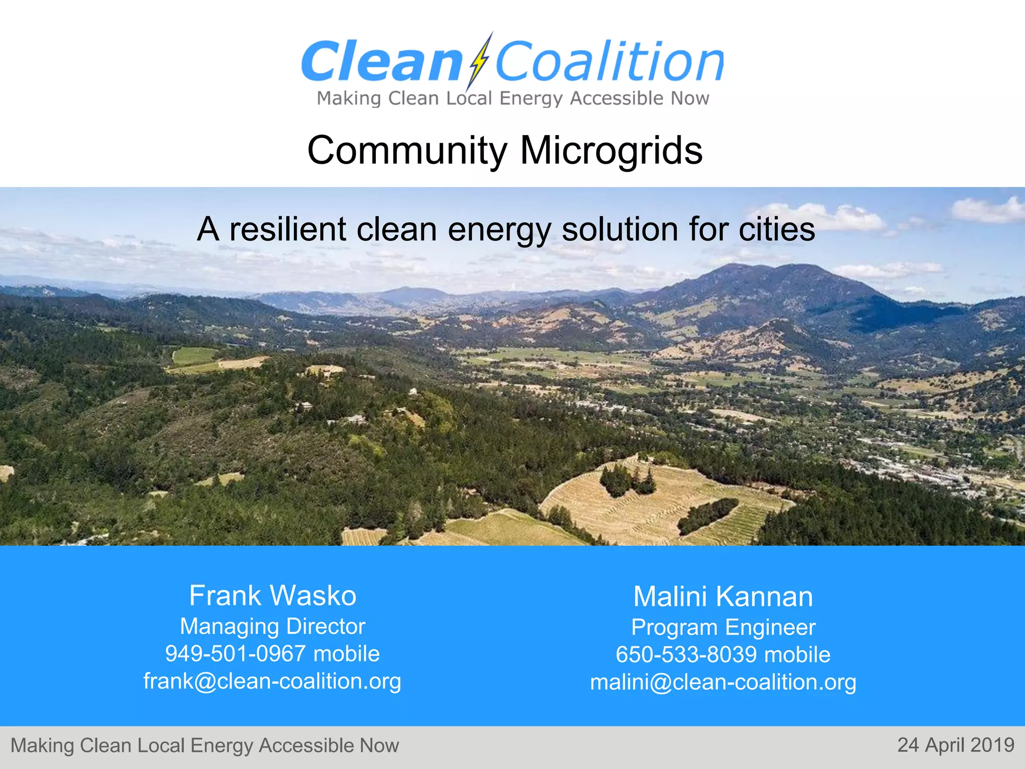 The document discusses the development of community microgrids as a resilient clean energy solution for cities, addressing the lack of reliability in traditional power grids, especially during extreme weather events and public safety power shutoffs. It emphasizes the benefits of microgrids, including reduced greenhouse gas emissions, local energy control, and increased safety, while highlighting economic and policy challenges to deployment. The Clean Coalition aims to develop standardized metrics to quantify the value of resilience provided by community microgrids, facilitating their broader implementation.