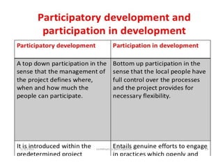 This document discusses community mobilization for health programs. It defines community mobilization as engaging community sectors in a plan to improve health through capacity building. Key elements include human rights, education, leadership, and participation. Effective community mobilization tailors messages to audiences like women, youth, and leaders. It involves defining the community, creating a community profile, informing others, and obtaining commitment through collaboration. The process employs community meetings and data collection to organize stakeholders and address community needs. Challenges can include time/costs, differing priorities between groups, sustaining volunteer motivation, and ensuring representative community participation.