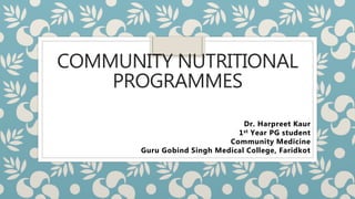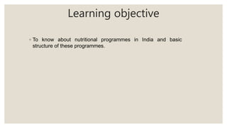 This document provides an overview of various community nutritional programmes in India. It discusses programmes targeted at pregnant and lactating mothers, children, adolescents, and elderly individuals. The key programmes described include the Integrated Child Development Services (ICDS) programme, National Nutritional Anemia Prophylaxis Programme, Mid-Day Meal programme, Vitamin A prophylaxis programme, and programmes under the Poshan Abhiyaan (National Nutrition Mission). The document provides details on the objectives, target groups, and services provided by these various nutritional programmes in India.