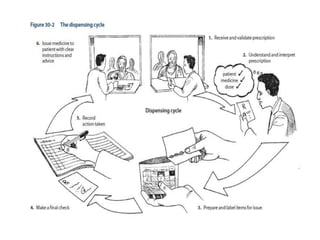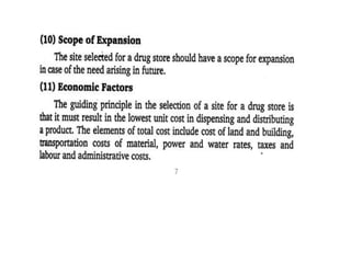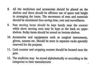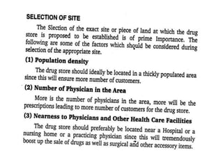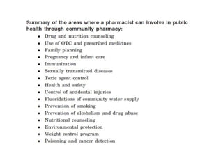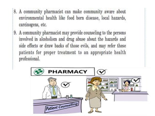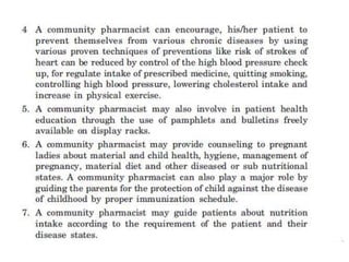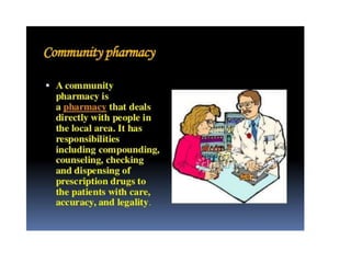 A community pharmacy is a local healthcare facility providing pharmacy services, including the dispensing of medicines, patient counseling, and participation in health promotion programs, operated by registered pharmacists. The scope of community pharmacy is expanding to include patient care, chronic disease management, over-the-counter medication guidance, and medical tourism, while adhering to legal requirements for operation and maintaining various records. Legal obligations include a formal application for licenses, space requirements, record maintenance for drug transactions, and compliance with regulations such as the Drug and Cosmetics Act.