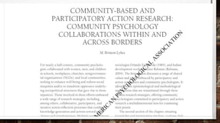 Community psychology focuses on prevention rather than treatment of psychological and social issues. It takes a collaborative approach, empowering communities to address their own needs. Community psychology examines how social and environmental factors at various levels impact behavior. The field aims to optimize community and individual well-being through innovative, community-driven interventions developed with other disciplines. It emphasizes strengths, diversity, empowerment, and ecological perspectives.