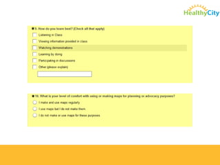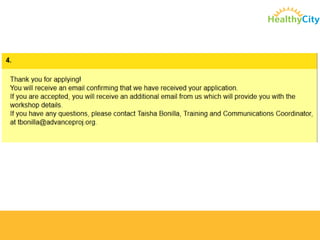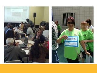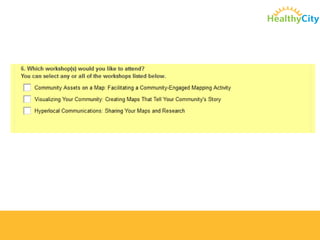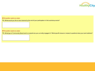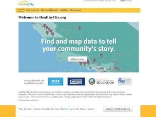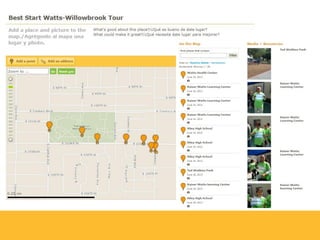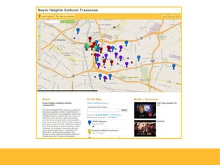 This document announces a series of free workshops on using online mapping tools and participatory research methods to engage communities and strengthen community-led action. The workshops will be held in San Diego, Ventura/Santa Barbara, and Orange County. They will teach participants how to create maps of community assets and issues, make maps that tell their community's story, and use social media to share research. The goal is to provide skills for communities to lead their own research on issues impacting their neighborhoods.