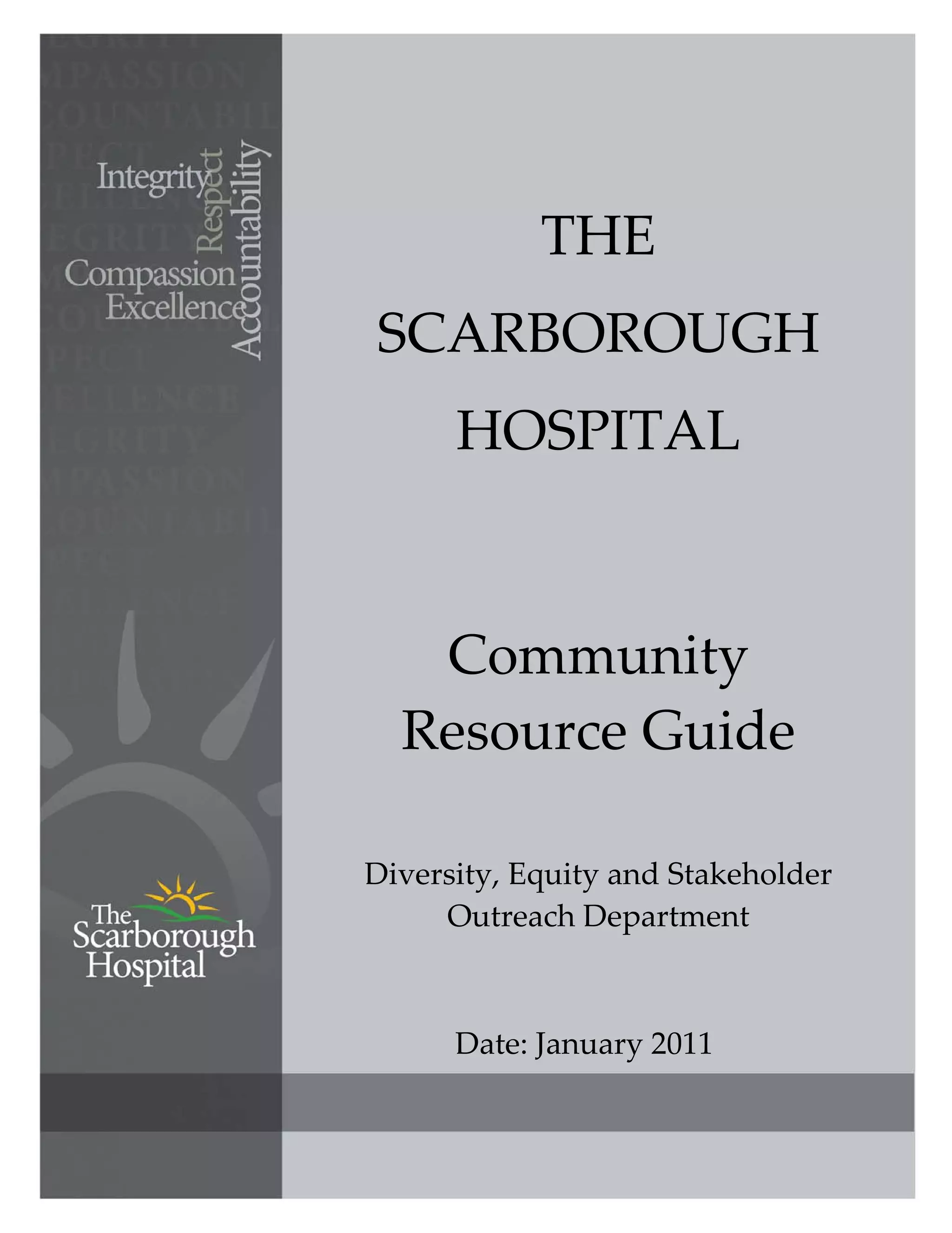 This document is a community resource guide from The Scarborough Hospital's Diversity, Equity and Stakeholder Outreach Department. It contains contact information for over 100 community services agencies, organized into 16 categories. The agencies provide services such as settlement assistance, health care, mental health support, interpretation, disability services, services for seniors, youth, women, and legal support. The guide aims to connect people in need with local resources.