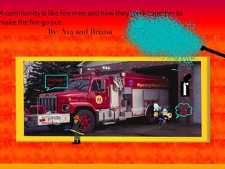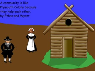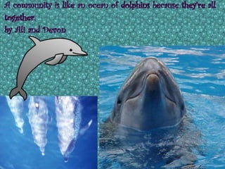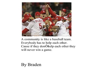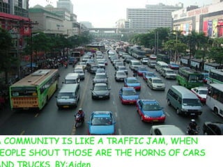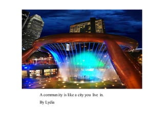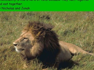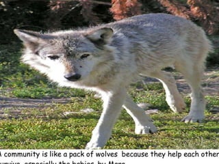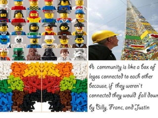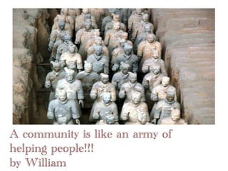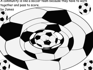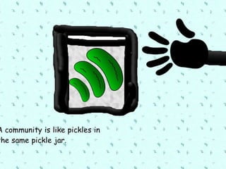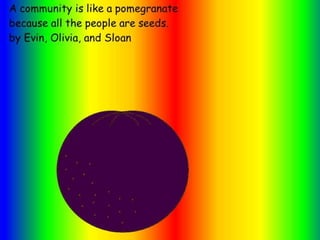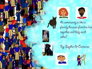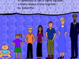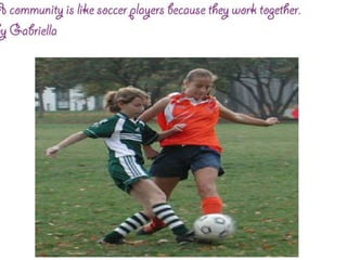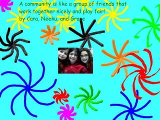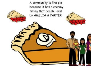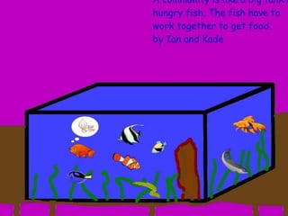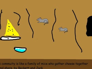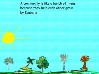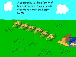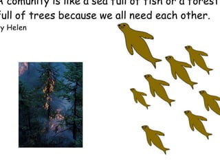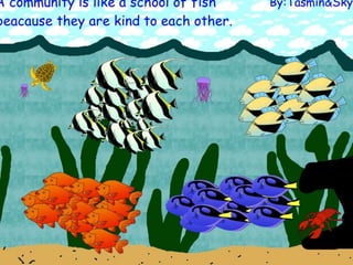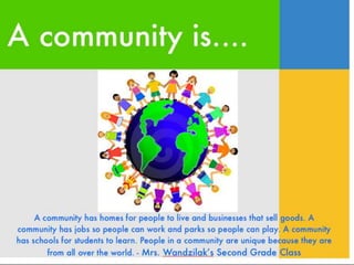 A community is defined through collaborative discussion between classes from around the world. It is described as a place where people help each other, work together, and make the community better through cooperation like various natural analogies such as a forest, coral reef, or bowl of chocolates where different parts contribute to the whole. Key aspects that emerge are that a community involves people coming together in a shared space to support one another.