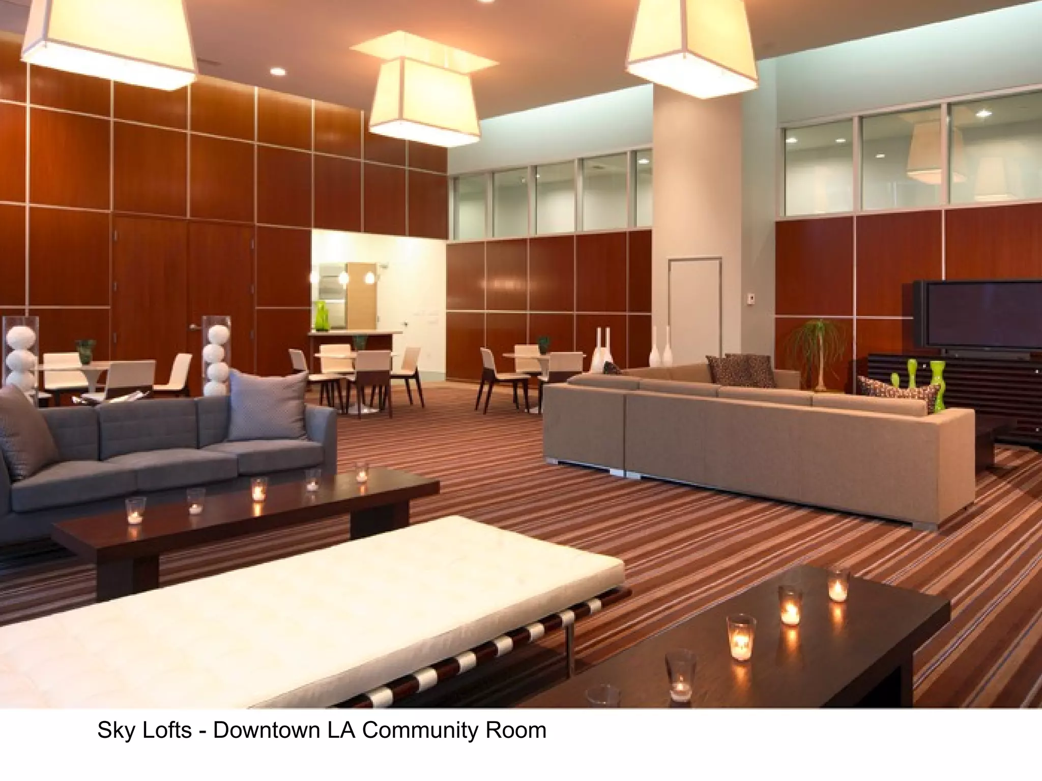 This document lists 9 different locations for events or gatherings at various apartment complexes in Los Angeles and nearby areas, including lobbies, community rooms, senior housing spaces, and a pool area at properties in downtown LA, Santa Monica, and Redondo Beach.