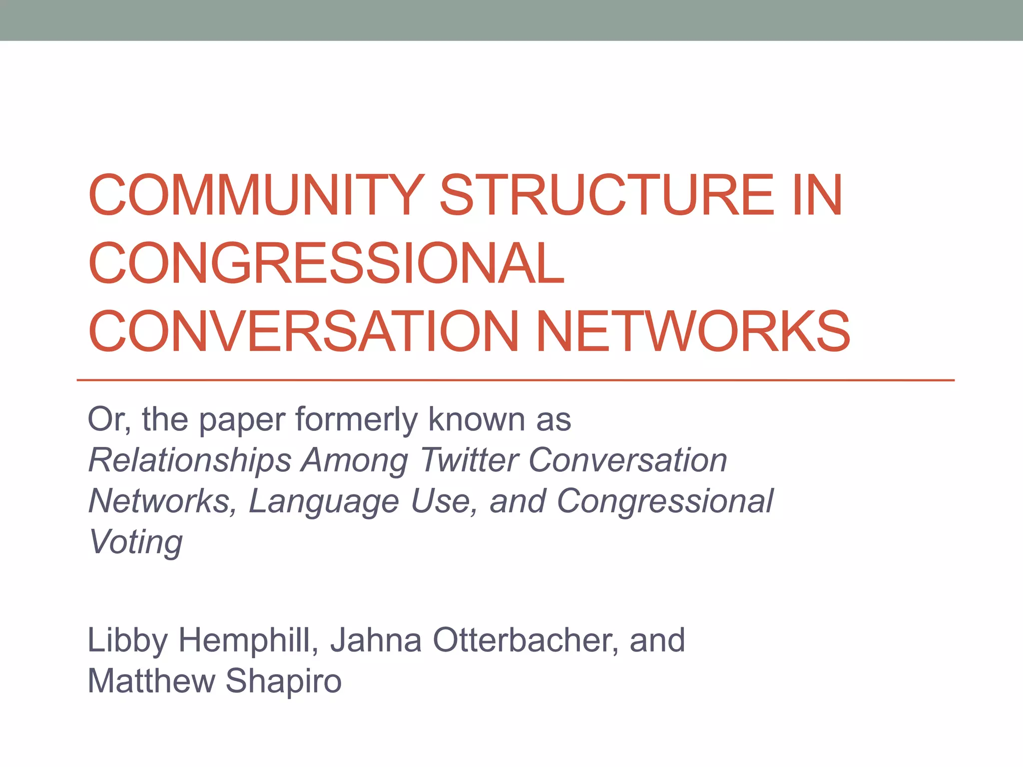 This document analyzes Twitter conversation networks among members of Congress. It finds that Republicans, Senators, and males are more likely to mention members of the opposing party or chamber in their tweets. Senators and males are also more likely to mention members of the opposing party. The networks indicate low cohesion among members and that a small subset of members are explicitly engaged by others, reflecting that Twitter is used more for selective outreach than broadcasting to all members. Overall, the networks on Twitter do not show more polarization than political blogs and represent new media being used for existing behaviors rather than entirely novel political interactions.