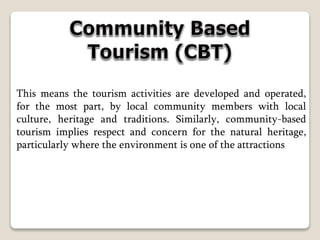 This document discusses community-based tourism (CBT) and provides criteria for evaluating CBT programs and services. It outlines 5 goals of CBT including contributing to community development, conservation, income generation, cultural empowerment, and cultural exchange. Principles and over 20 criteria are defined for evaluating CBT programs, services, and impacts across accommodation, food, transport, activities, guides, hosts, information, souvenirs, communication, and coordination. The criteria focus on sustainability, services quality, and achieving the goals of CBT.