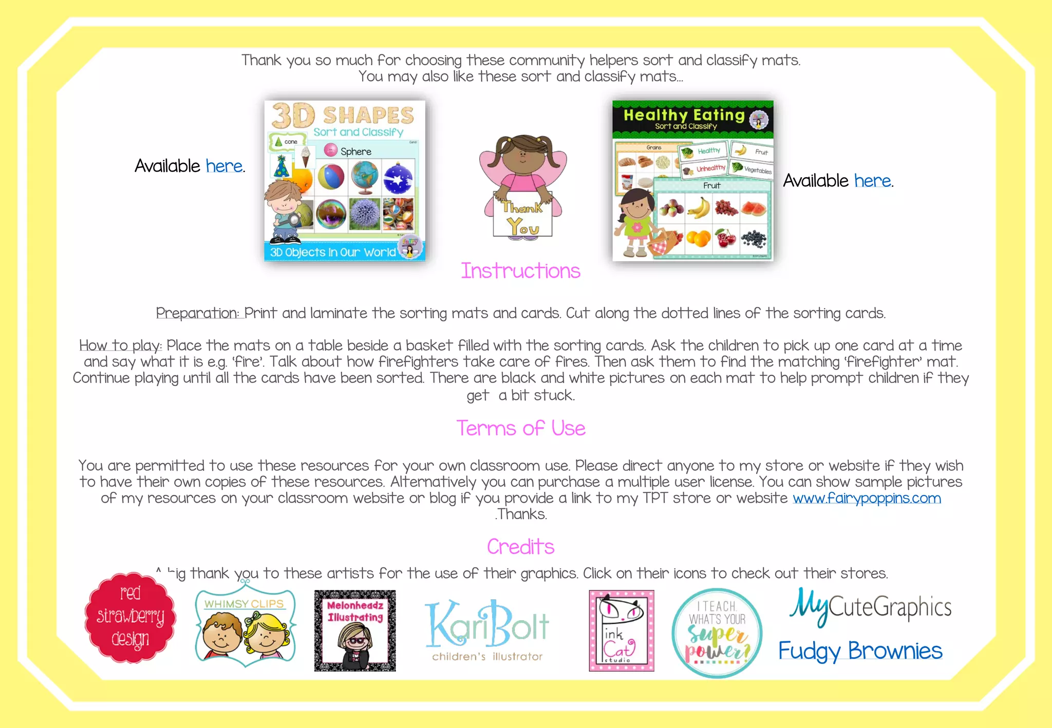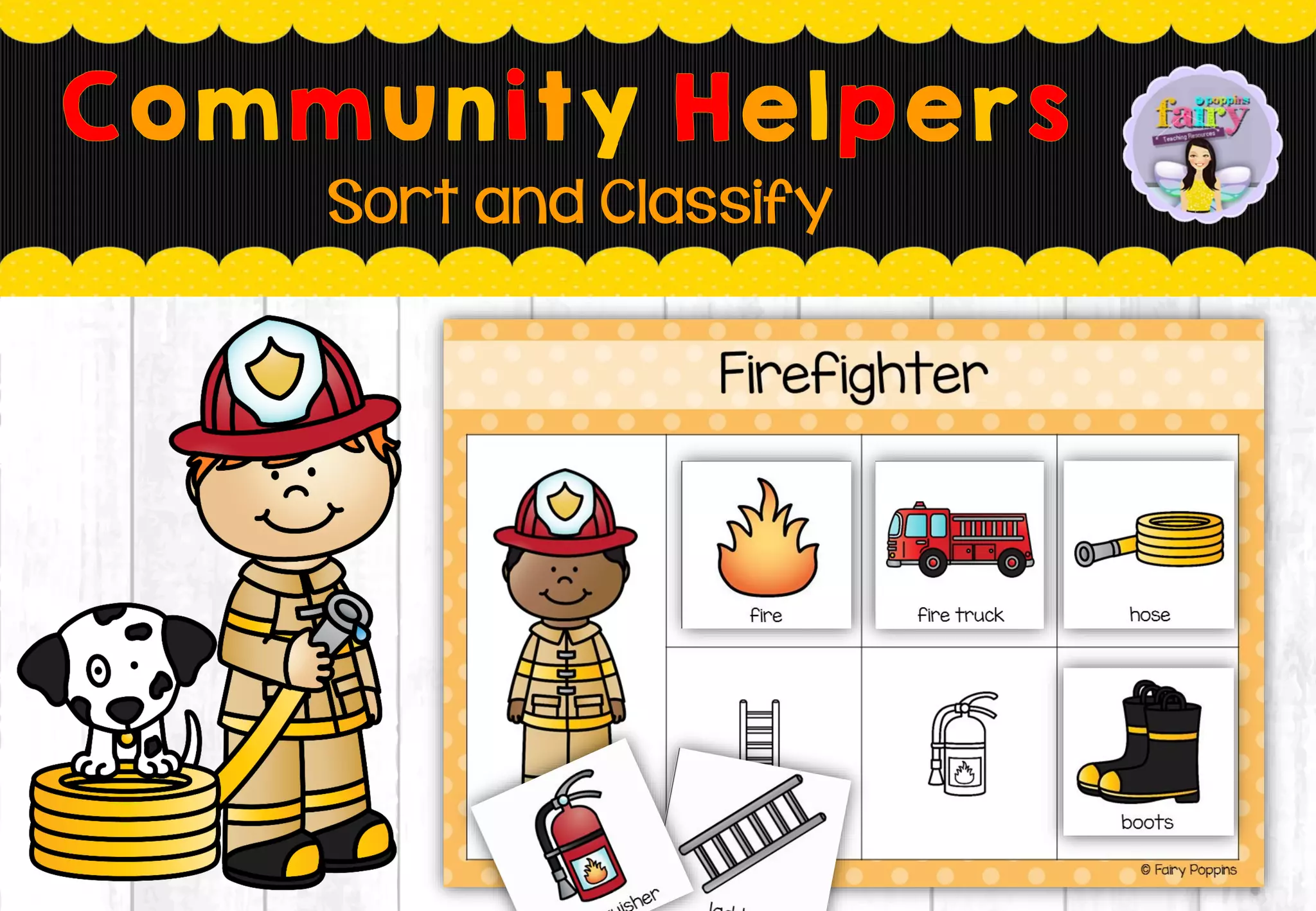 The document provides instructions for a sort and classify activity using community helper mats and cards. Children are instructed to pick up cards showing items related to different community helpers like firefighters, doctors, and police officers. They then sort the cards onto matching mats that feature images related to each community helper. The activity is intended to teach children about different jobs and how community helpers help people.