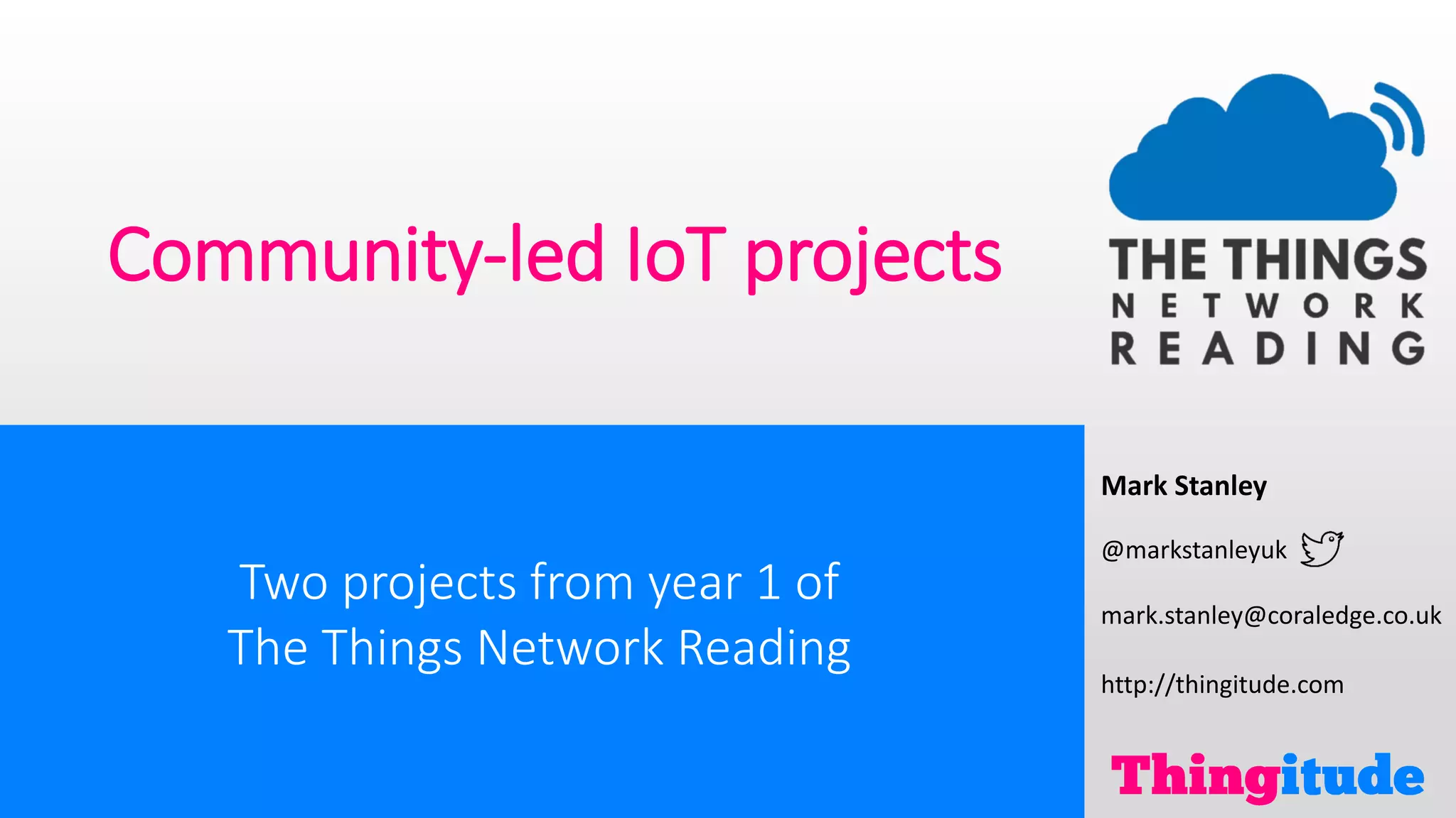The document discusses two community-led IoT projects initiated in Reading, focused on the Things Network and its expansion within the local community. It highlights the Reading Hotspot Project and a collaboration with BBC micro:bit, evaluating the potential for a profitable IoT business model. The document invites community interest and participation in upcoming gatherings and projects.