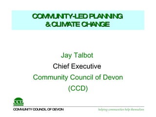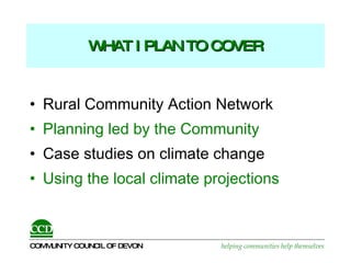 The document discusses the role of community-led planning in addressing climate change in rural England, emphasizing the collaborative efforts of local communities and organizations. It presents various case studies demonstrating how different communities engage in climate action and develop plans that involve local governance and social inclusion. The document highlights the importance of local knowledge, effective emergency planning, and the need for greater integration of climate change considerations into community development initiatives.