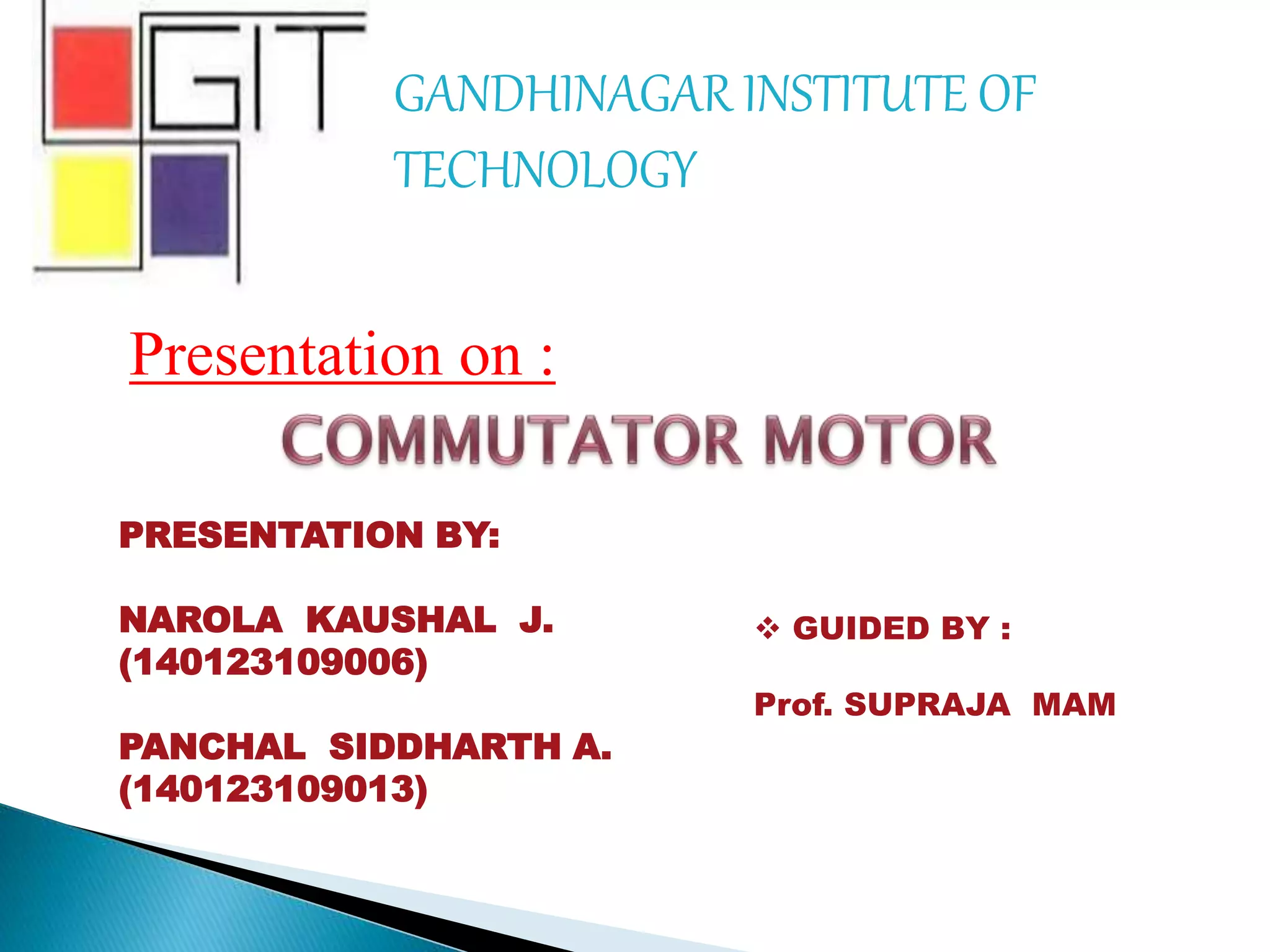 This presentation compares and contrasts two types of motors: the three phase schrage motor and the repulsion motor. The three phase schrage motor uses a commutator to produce unidirectional torque and can operate on AC or DC supply. It has a complicated structure but allows for easy speed and power factor control. The repulsion motor has a stator, rotor, commutator and brushes. It works by inducing voltage in the rotor conductors using the stator flux. Speed is varied by shifting the brushes. Both motors have applications in industrial machinery where variable speed is important.