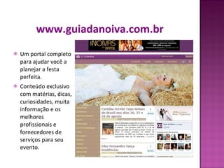Este documento descreve os serviços de publicidade oferecidos pelo portal www.guiadanoiva.com.br para auxiliar no planejamento de casamentos. O site oferece banners, anúncios fixos e matérias patrocinadas para divulgar profissionais e fornecedores de serviços para eventos. Os planos começam a partir de R$50 para anúncios simples e R$125 para banners.