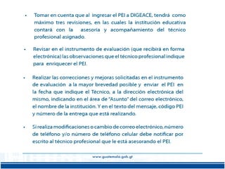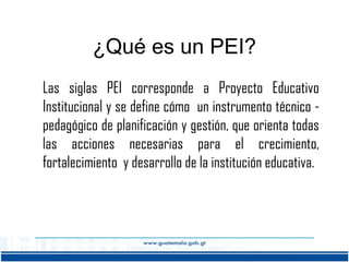 Este documento proporciona información sobre cómo elaborar un Proyecto Educativo Institucional (PEI). Explica que el PEI es un instrumento técnico-pedagógico que orienta las acciones de una institución educativa. Detalla los componentes de un PEI, incluyendo la visión, misión, proyecto curricular, organización administrativa y diagnóstico. Además, describe el proceso de elaboración de un PEI, incluyendo la participación de la comunidad educativa y los pasos metodológicos requeridos.