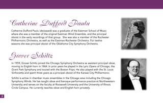 This document provides information about Catherine Dufford Paulu and Grover Schiltz, both experienced oboe players, as well as instructions for starting a student on the oboe. It includes directions on assembling and caring for the oboe, forming the embouchure, soaking and storing reeds, adjusting commercial reeds, troubleshooting reed problems, and an oboe fingering chart. The document is intended to help band and orchestra directors who need to teach the oboe but are not oboe players themselves.