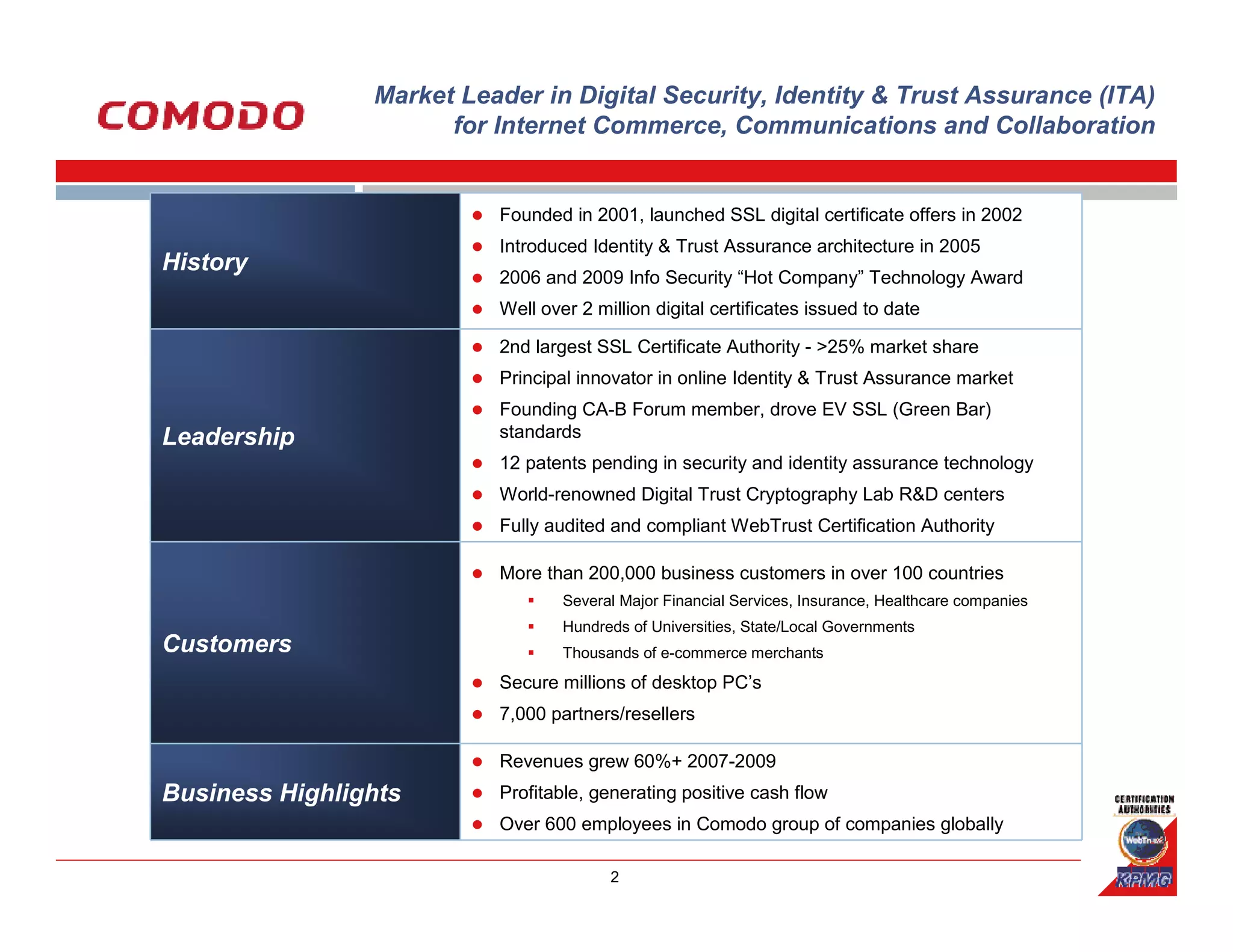 Comodo is a leading digital security company that was founded in 2001. It has over 2 million digital certificates issued and is the 2nd largest SSL certificate authority with over 25% of the market share. Comodo offers a complete portfolio of internet security and authentication solutions for businesses, online merchants, and consumers.