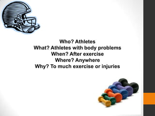 The document discusses a mobile app being developed by students to help athletes treat and avoid body problems like injuries and sore muscles that occur after exercise. The app aims to be user-friendly and simple by asking users questions about their condition and providing answers and treatment recommendations for their body problems. The team was not able to conduct interviews due to a lack of time so they included wireframes of the app's design instead.