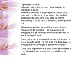 Documentul subliniază importanța recunoașterii simptomelor comotiei cerebrale și a accidentului vascular cerebral (stroke) pentru a salva vieți. Se oferă un exemplu tragic în care o persoană a murit din cauza incapacității prietenilor de a identifica simptomele unui stroke. Informațiile despre cum să recunoști un stroke sunt prezentate sub forma a trei întrebări simple, iar autorii îndeamnă cititorii să răspândească aceste cunoștințe pentru a ajuta la salvarea unor vieți.