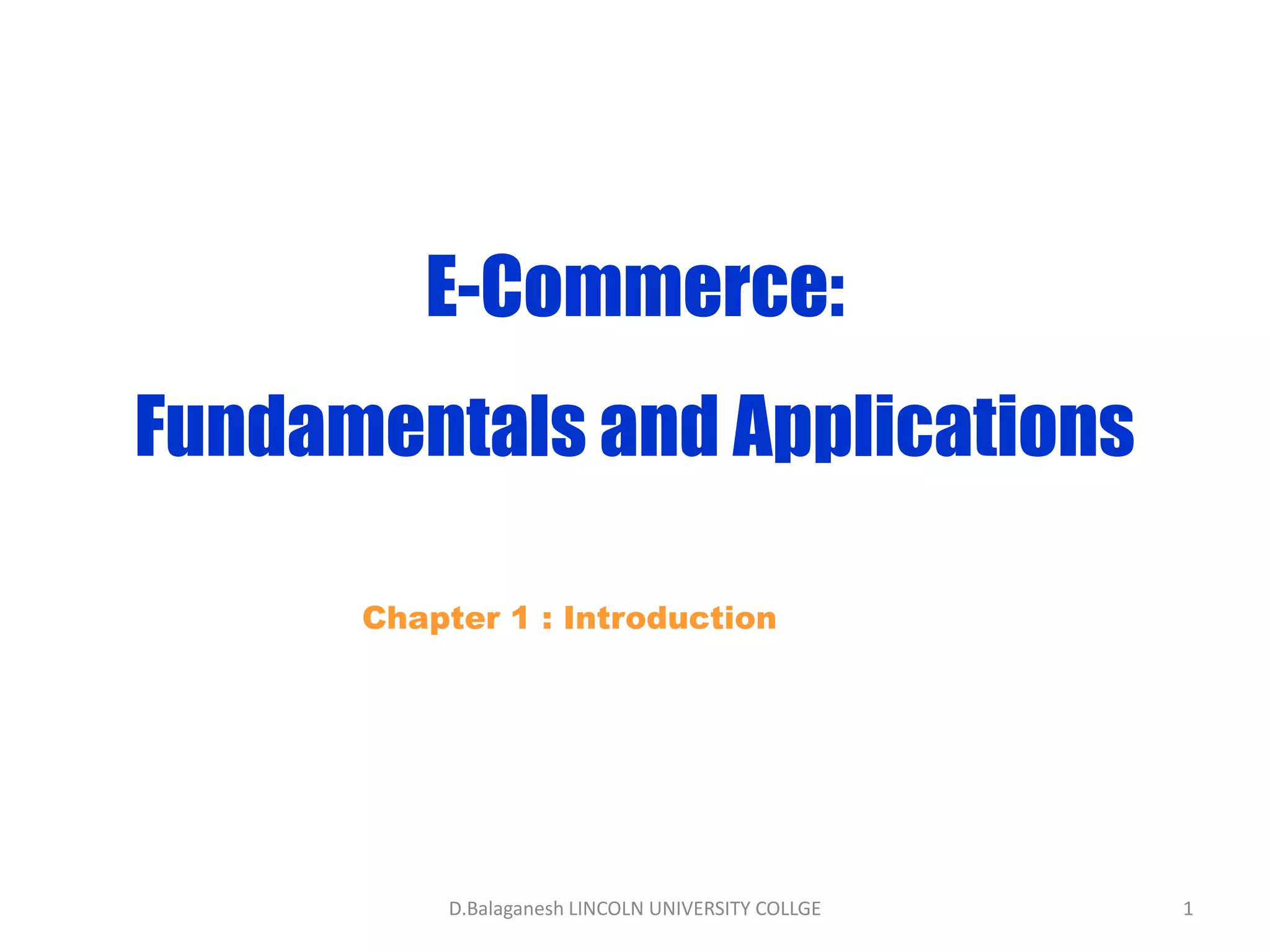 This document outlines the key topics to be covered in a course on e-commerce fundamentals and applications. It discusses the drivers of e-commerce like data networks and technologies. It defines different types of e-commerce models including B2C, C2C, B2B and C2B. Examples are provided for each type. Advantages of e-commerce for both consumers and businesses are listed. The document also describes how organizations must integrate different departments for successful e-commerce projects and presents a three-tier technical model for e-commerce systems.