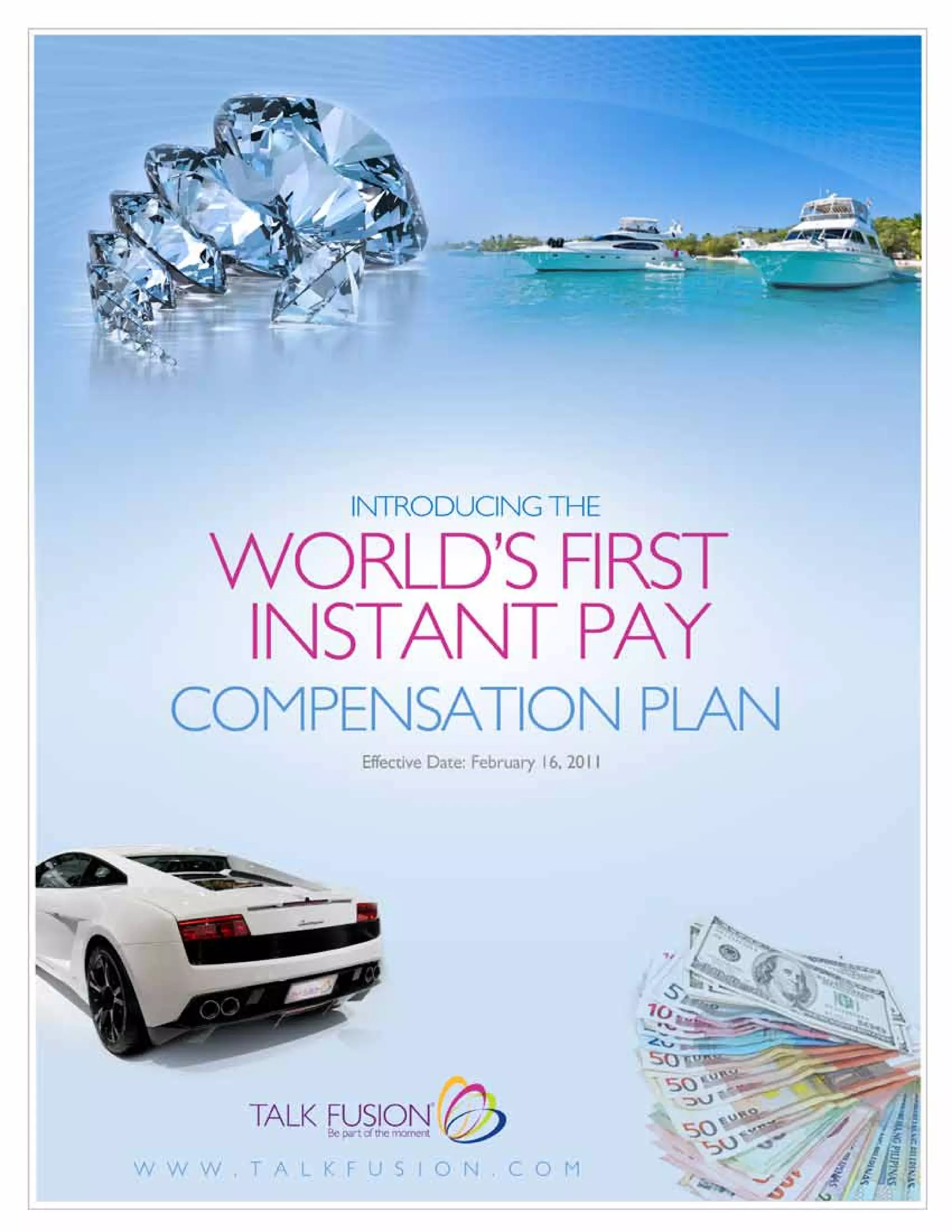 The document summarizes the compensation plan for Talk Fusion Associates. There are 6 ways to earn income: 1) Fast Start Bonuses, 2) Team Commissions, 3) Bronze Maker Bonuses, 4) Mega Matching Bonuses, 5) Advancement Bonuses, and 6) Leadership Pool. Details are provided on requirements and payouts for each type of income. The document also addresses frequently asked questions about the compensation plan mechanics.