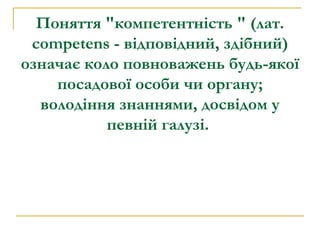 Поняття "компетентність "(лат. competens - відповідний, здібний) означає коло повноважень будь-якої посадової особи чи органу; володіння знаннями, досвідом у певній галузі.