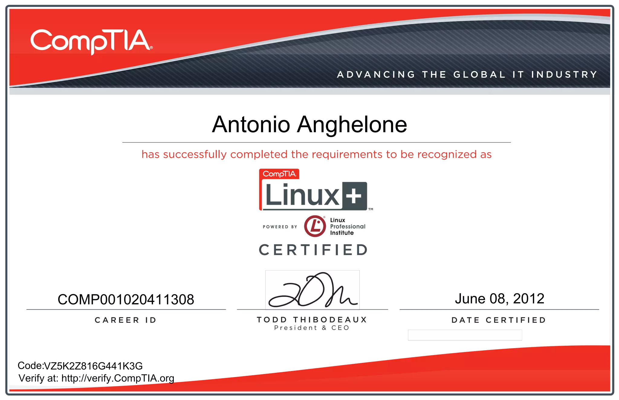 Antonio Anghelone has completed the requirements to be recognized as a Linux Professional by the Linux Professional Institute. He received certification in Linux administration on June 08, 2012. The certification is valid through a unique code that can be verified online.