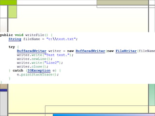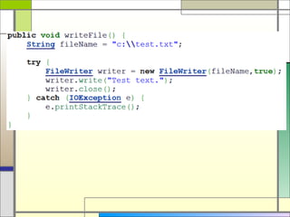 The document discusses file handling in Java. It covers:
