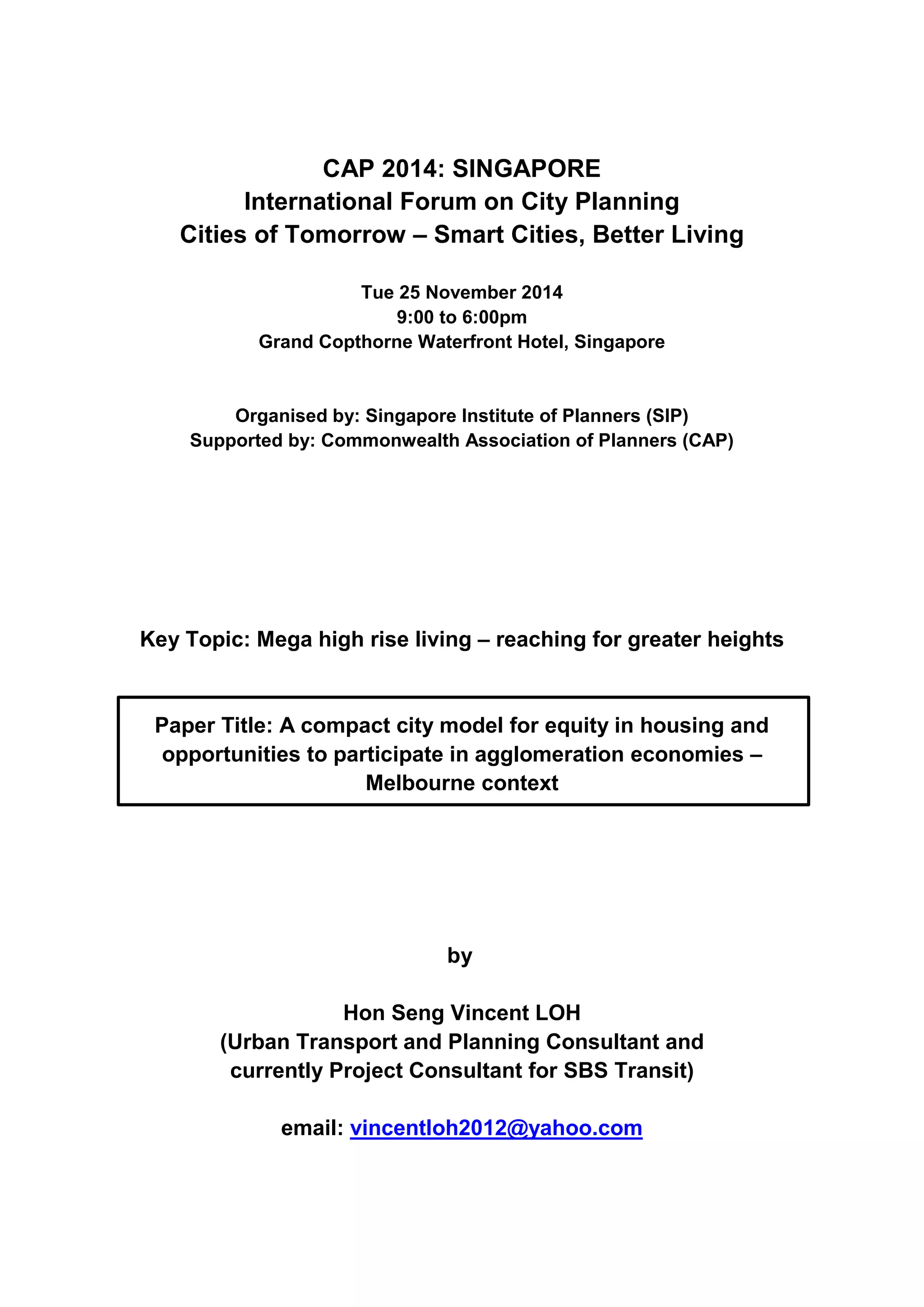 This document summarizes a paper presented at the International Forum on City Planning in Singapore that discusses housing and economic issues in Melbourne, Australia arising from urban sprawl and the lack of affordable housing near jobs. The paper examines how economic shifts have led to the concentration of knowledge-intensive jobs in central areas, driving up housing costs and limiting access to opportunities for those living farther out. It proposes that compact city and transit-oriented development models could help improve connectivity between housing, jobs, and services to address inequities.