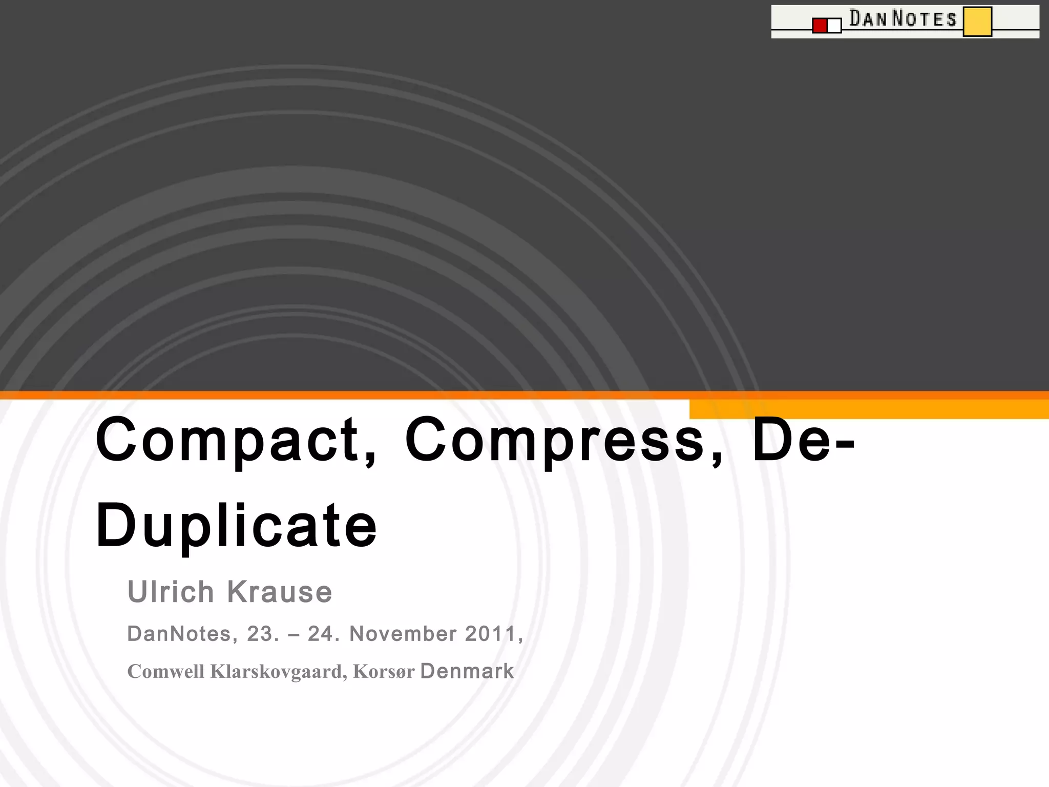 The document discusses techniques for compacting, compressing, and de-duplicating data in Domino applications to reduce storage usage and improve performance. It covers compacting databases, compressing design elements, documents, and attachments, using DAOS to store attachments externally, and tools for defragmenting files.