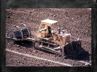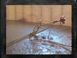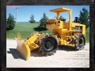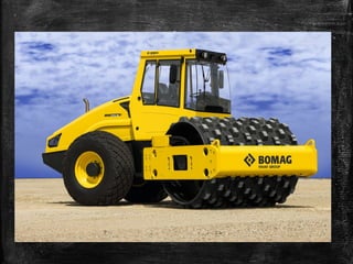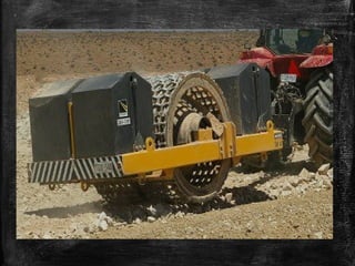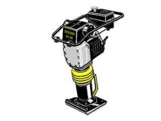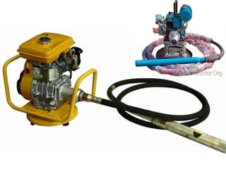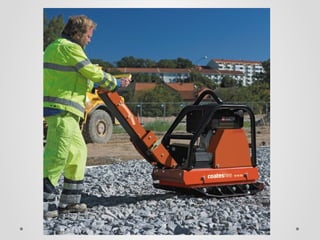The document discusses soil compaction and various types of compaction equipment, highlighting their functions and suitable applications. It details different equipment such as smooth wheel rollers, sheep foot rollers, pneumatic rollers, and various vibrators for concrete consolidation. Additionally, it describes the role of compacting equipment in enhancing soil stability, reducing permeability, and preventing erosion.