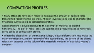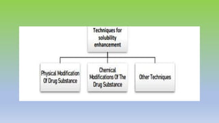 The document explores various techniques for enhancing drug solubility and discusses the significance of compaction profiles in drug formulation. Key topics include particle size reduction through micronization and nanosuspension, as well as methods like cocrystallization and solid dispersions to improve bioavailability of poorly water-soluble drugs. It emphasizes the importance of solubility in pharmaceutical development, detailing physical and chemical modification techniques to facilitate drug absorption and efficacy.
