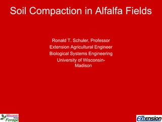 This document discusses soil compaction issues in alfalfa fields and strategies to mitigate compaction. It covers how compaction can be caused by wheel traffic, tillage, and precipitation. Key factors that influence compaction are tire size, inflation pressure, radial vs. bias ply design, avoiding wet soil during field work, proper wheel alignment of equipment, selecting lighter machinery, and distributing traffic across fields. The document provides details on measuring soil compaction and recommends best practices like using wider equipment that merges windrows to reduce wheel passes and choosing self-propelled versus pull-type machinery.