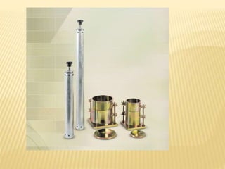 The document discusses compaction tests for soil. It defines compaction as packing soil particles more closely together through dynamic loading, reducing air voids without changing water content. Compaction improves soil engineering properties like strength and permeability. Laboratory tests establish relationships between dry density and moisture content under controlled conditions. The standard Proctor test uses a 2.6 kg hammer and the modified Proctor test uses a 4.89 kg hammer, transmitting more energy to achieve higher compaction. Both tests yield curves showing maximum dry density occurs at optimum moisture content.