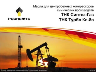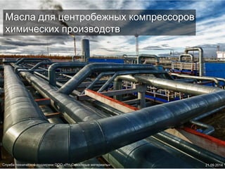 Документ описывает масла, используемые в центробежных компрессорах химических производств, их функции и эксплуатационные характеристики. Приводятся примеры масел, таких как тнк синтез газ и тнк турбо, а также их преимущества, включая высокие антиокислительные свойства и снижение образования отложений. Рассматриваются также проблемы, возникающие при использовании традиционных турбинных масел в экстремальных условиях и необходимость использования специализированных масел.