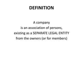The document provides an overview of companies in Malaysia, detailing their definitions, classifications, and types based on liability and status. It explains different company forms such as companies limited by shares, by guarantee, and unlimited companies, along with regulations governing private and public companies. Additionally, it outlines the distinction between holding and subsidiary companies and the requirements for foreign companies operating in Malaysia.