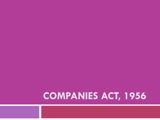 The document summarizes key aspects of company law in India as outlined in the Companies Act of 1956. It defines a company and lists its key characteristics such as separate legal entity status, transferable shares, and limited liability. It outlines different types of companies based on incorporation, liability, nationality, and public interest. It also describes the different types of companies that fall under each of these categories, such as private vs. public companies. Finally, it discusses the key documents of a company, namely the Memorandum of Association and Articles of Association.