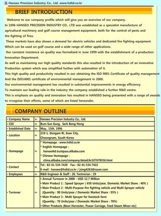 Hanseo Precision Industry Co., Ltd. is a South Korean manufacturer of agricultural machinery and golf course equipment established in 1996. It produces speed sprayers, multi-purpose firefighting vehicles, multi-sprayers for livestock farms, and other machinery. Hanseo aims for high quality and innovation through an emphasis on R&D and obtaining certifications like ISO 9001. It operates three factories and has won several awards recognizing its efforts and contributions to industry.