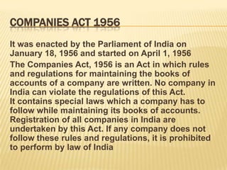 The document summarizes key aspects of the Companies Act of 1956 in India. It discusses that the Act was enacted by the Indian Parliament in 1956 and regulates how companies must maintain their books of accounts. It establishes rules around the formation, management, meetings and winding up of companies. The Act also requires all companies operating in India to register. It classifies companies based on aspects like incorporation, liability, ownership and control.