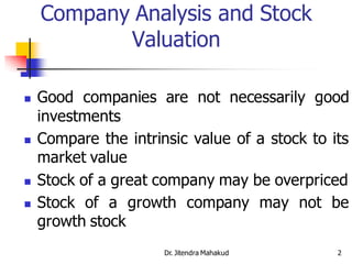 The document discusses company analysis and stock valuation. It provides guidance on analyzing a company's competitive strategies, growth potential, management quality, and financials to estimate intrinsic value. Key steps include conducting a SWOT analysis, comparing intrinsic value to market price, and monitoring assumptions to determine when to sell. The overall aim is to identify undervalued stocks by focusing on long-term prospects and downside protection.