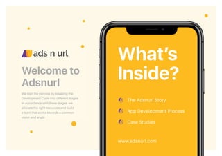 This document summarizes the mobile app development process and services of Adsandurl. It describes the stages of the process as ideation, strategy, design sprint, MVP phase, and launch. It also lists the tools, languages, and frameworks used like Figma, Swift, React Native, Firebase, and provides examples of case studies and client apps developed. The document is intended to provide an overview of Adsandurl's mobile app development capabilities.