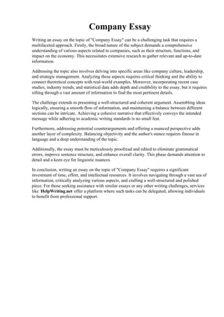 Writing an essay on the topic of 'company' requires extensive research and a multifaceted approach to understand the complexities of companies, their operations, and economic impact. Key challenges include structuring a coherent argument, incorporating case studies, and maintaining academic writing standards, along with meticulous proofreading for clarity. This task highlights the importance of professional writing services like helpwriting.net for those facing difficulties in essay writing.